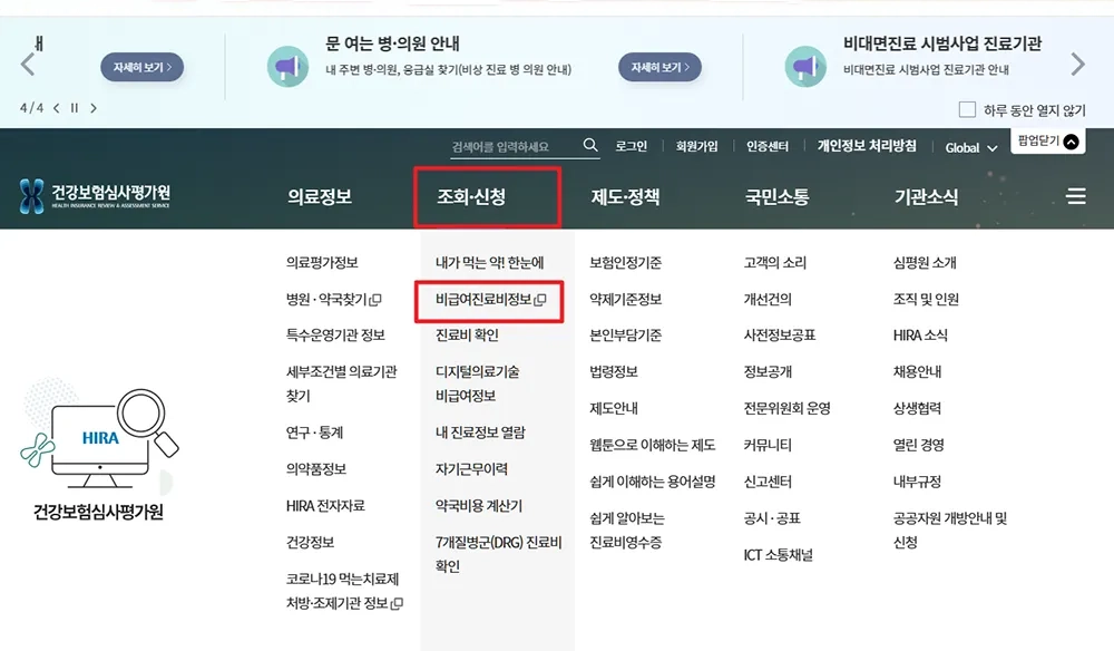- 건강보험심사평가원 사이트에 접속 후 “조회/신청” 메뉴에 마우스를 올리면 하위 메뉴가 나타나는데, 거기서 “비급여진료정보”를 클릭합니다.
