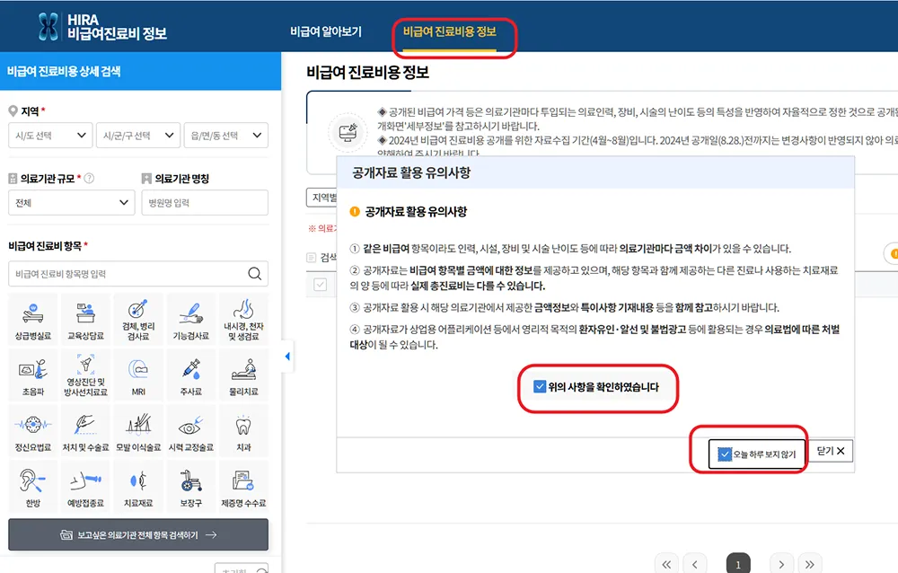 - 상단 메뉴 중 두 번째인 “비급여 진료비용 정보”를 클릭한 후 공개자료 활용 유의사항에 체크합니다.