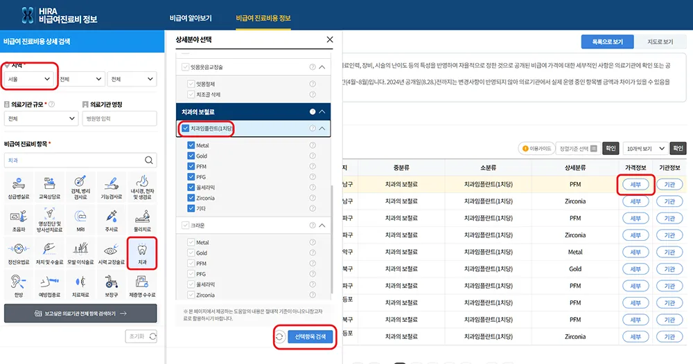 - 지역에서 본인이 사는 곳을 선택한 후, 비급여 진료비 항목에서 치과를 선택합니다. 이후 상세분야 팝업창이 뜨면 스크롤을 조금만 내려 “치과의 보철료” 메뉴 아래 “치과임플란트(1치당)”을 선택한 후 검색을 합니다. 검색된 치과에서 우측에 있는 “가격정보”의 세부 버튼을 클릭하시면 임플란트 1치당 가격을 확인하실 수 있습니다.